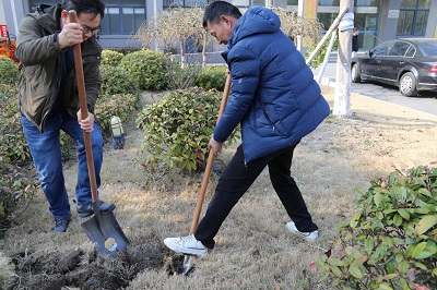 在建湖上冈沥青拌和场内,随着公司工会主席的一声号召,大家即刻展开植树行动。虽然天气仍然有些阴冷,但大家精神饱满,干劲十足。大家认真地按照植树的技术要领,瞄线扶树、挥锨培土、调整踩实、移管浇水,全体人员通力配合,每个环节井然有序。经过大家1个小时的辛勤劳作,新栽种的黄芽树苗迎风挺立,它们沐浴着春风,焕发出春天的色彩,也为美丽公路再添了一抺新绿。